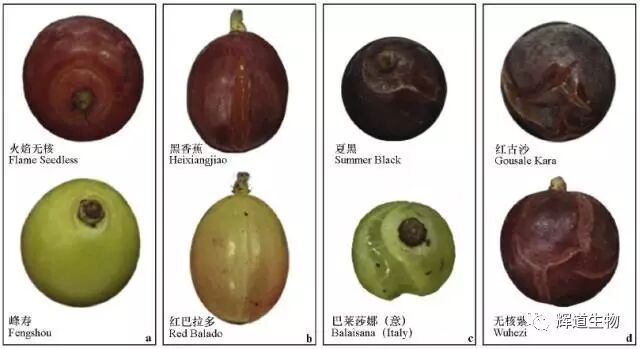 最后一种为龟裂(图d),一般在田间发生得比较少,仅在欧亚种葡萄出现。龟裂为不规则裂,会布满整个果粒。